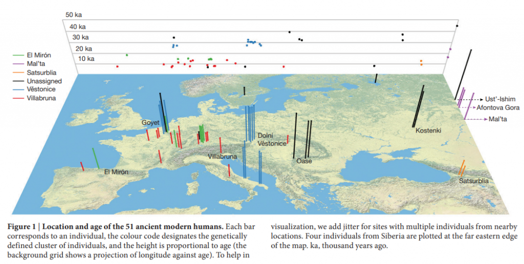 위 그림은 51명의 고대 현생 인류의 위치와 연대를 나타낸 지도입니다. 각 막대는 개별 인류를 나타내며, 색상은 유전적으로 구분된 집단을, 높이는 연대에 비례합니다(배경 격자는 경도와 연대의 관계를 보여줍니다). 시각화를 돕기 위해 인접한 위치에서 여러 인류가 발견된 지점에는 미세한 간격을 두었습니다. 시베리아에서 발견된 네 명의 인류는 지도의 가장 동쪽 끝에 표시되어 있습니다. ka는 천 년 전을 의미합니다.